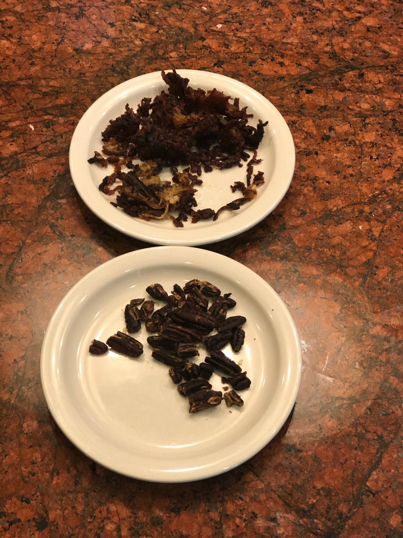 I was distracted! I was playing a game on my phone to pass the time. I had plenty of time but then I got engrossed with playing that game and lost track of time. The result…burnt pecans. You would think I’d learned my lesson! Nope, I got focused on making the filling for my pie and I forgot about the hash browns in the oven. By the time I remembered, they were burnt!