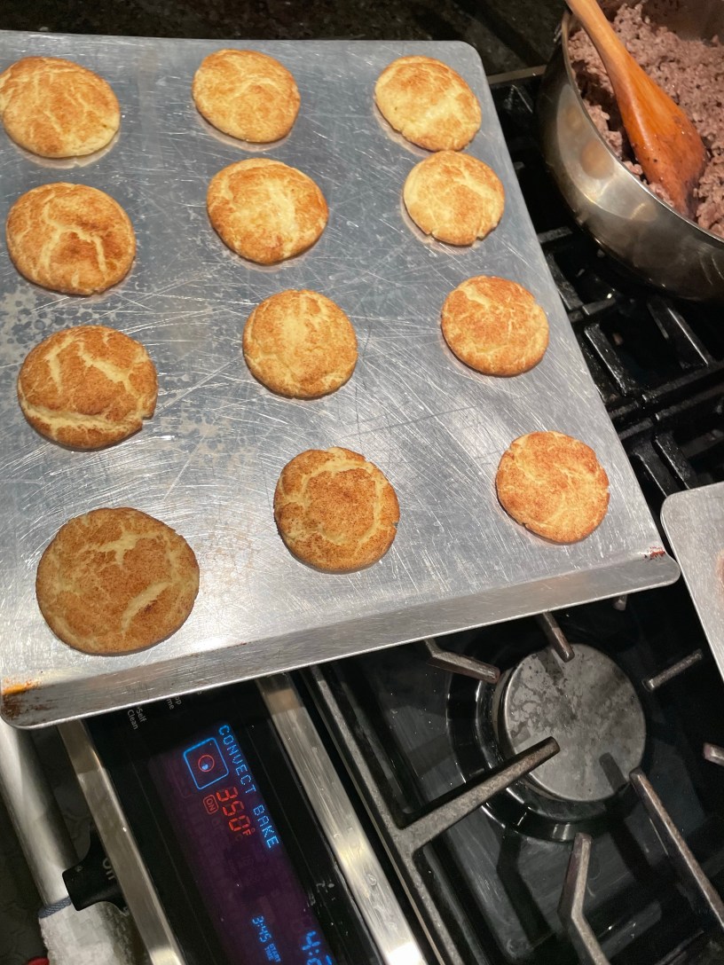 I seasoned the chicken to make a brown sugar stewed chicken. While that was marinating, I got out all the ingredients to make snickerdoodles AND sugar cookies. I whipped up the cookie batters pretty quickly. While the snickerdoodles were cooking, I was jamming to and singing along with Whitney making the sugar cookies. Once the snickerdoodle cooled some, I moved them to the cookie rack. I then rolled and sugared the sugar cookies; putting them in the oven. I sent some snickerdoodles to my sister neighbor as she had been asking me when I would make them. It was then the Lord spoke.